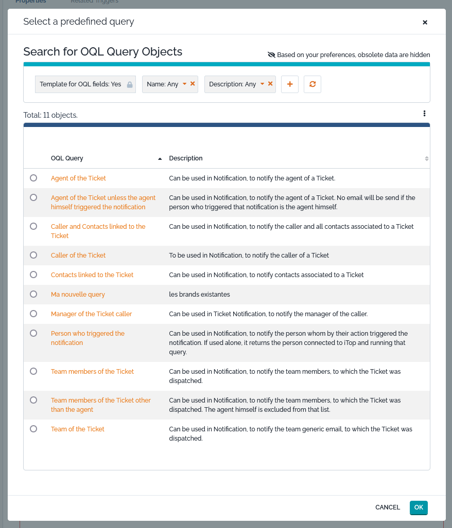The contacts to be notified in the “To”, “Cc”, and “Bcc” are defined by an OQL query. This allows to specify multiple recipients for the notification, like “all the contacts attached to a ticket” or “all the contacts on the impacted site”.