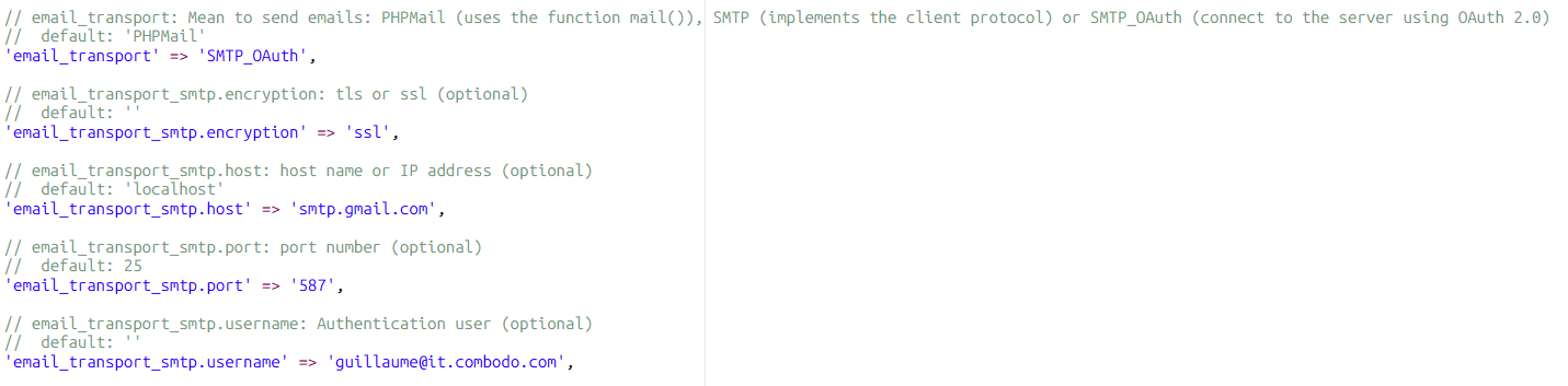 // email_transport_smtp.encryption: tls or ssl (optional) // default: '' 'email_transport_smtp.encryption' => 'ssl',