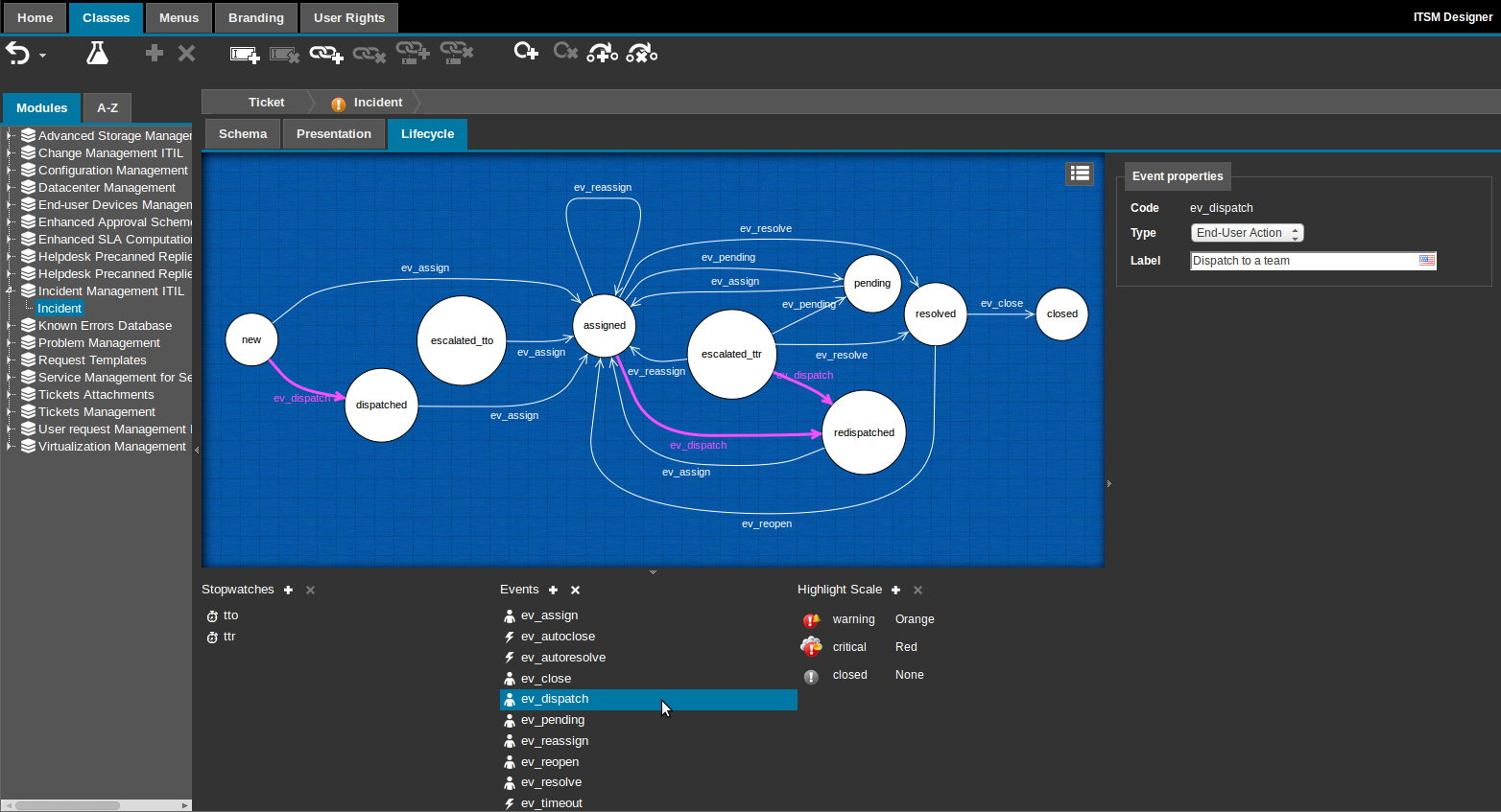 iTop uses a Highlight Scale to define the appearance of an object of a given class. Two parameters of the appearance can be customized by the means of the Highlight Scale: the background color of the object in lists and the icon of the object.