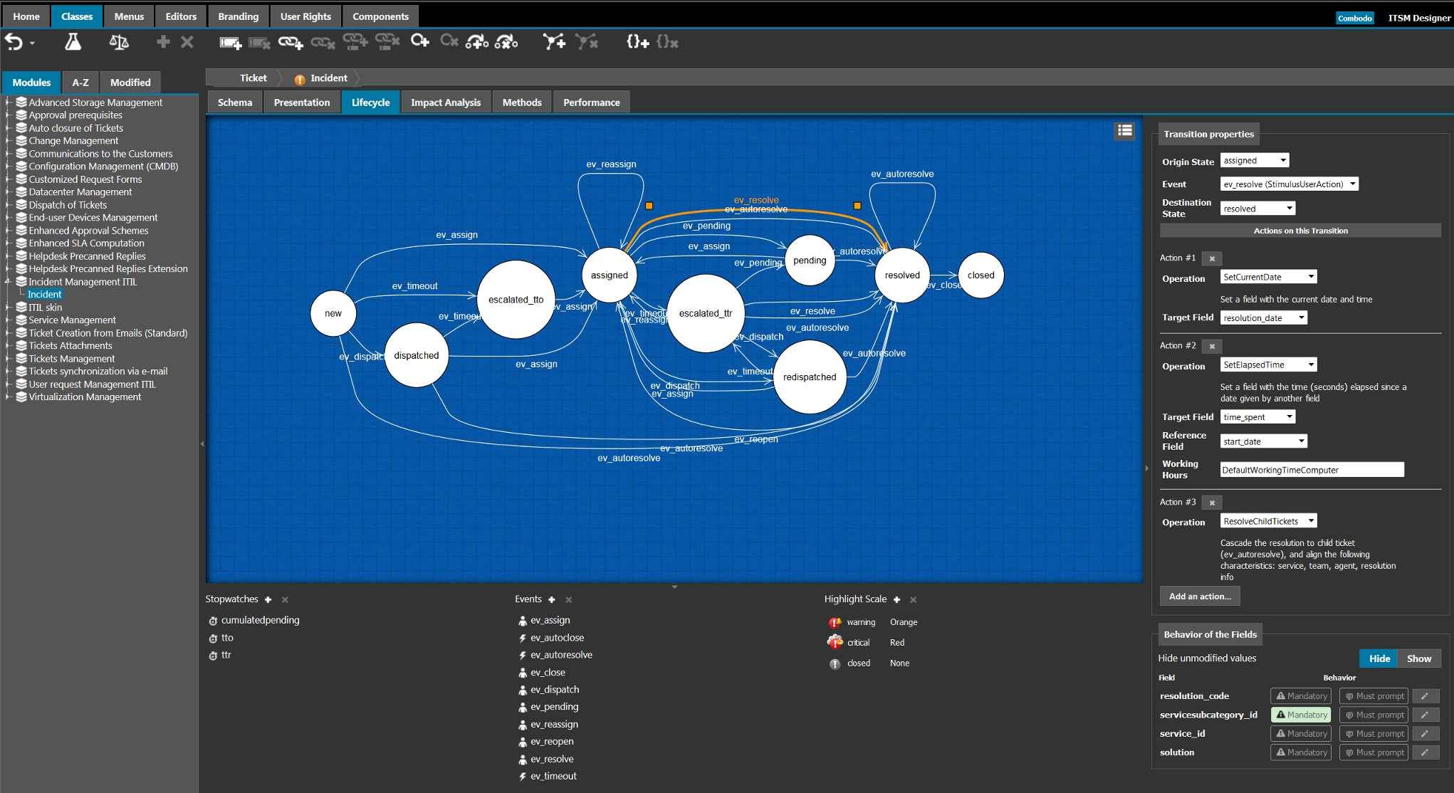 The lifecycle is used to define a simple workflow for classes like tickets, where the behavior of the fields depend on the state of the ticket (a field may be editable only during some specific phases, mandatory in another phase or even completely hidden)