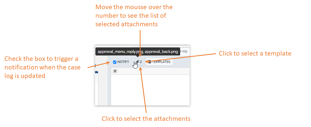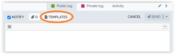 When modifying a Ticket, the public case log contains a new button “Templates” in its header: