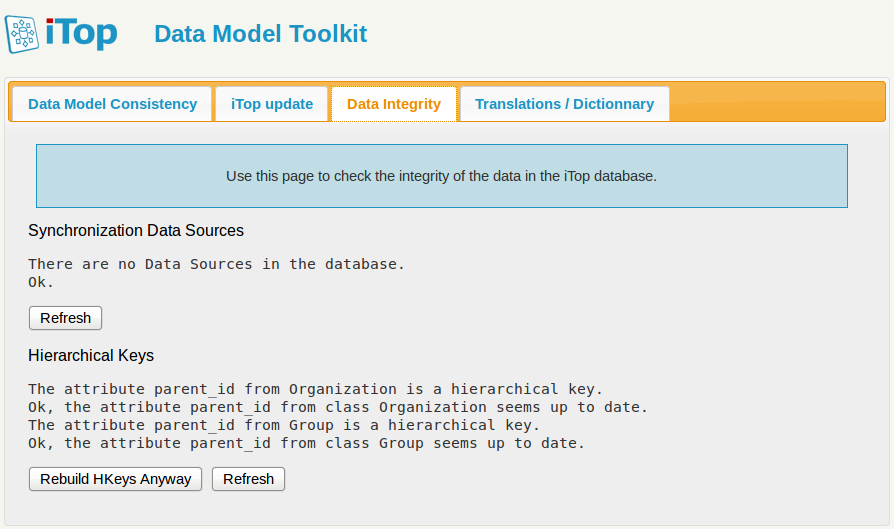 The first tab performs some basic consistency checks and validation of the data model definition. You can use the “Refresh” button to perform the validation again each time the data model definition has changed. The checks performed in this tab work on the specific “toolkit” environment and thus have no effect on the actual iTop instance that uses the “production” environment.