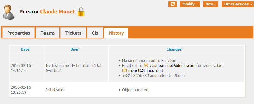 Then modify the text file “persons.csv” in the directory “data” under the root of iTop, by fixing the last line at the end (replace Test by Demo):