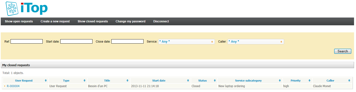 The section “Show closed requests” allows the end-user to search into the closed tickets created by himself.