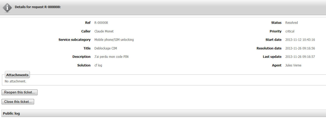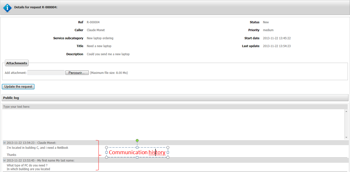 One important feature of the portal is to allow end-user to track the activity on their requests. To get the details and communicate with the technical support agents, the just have to click on the link of one of their request. The end-user can view the history of the communication in the public log: