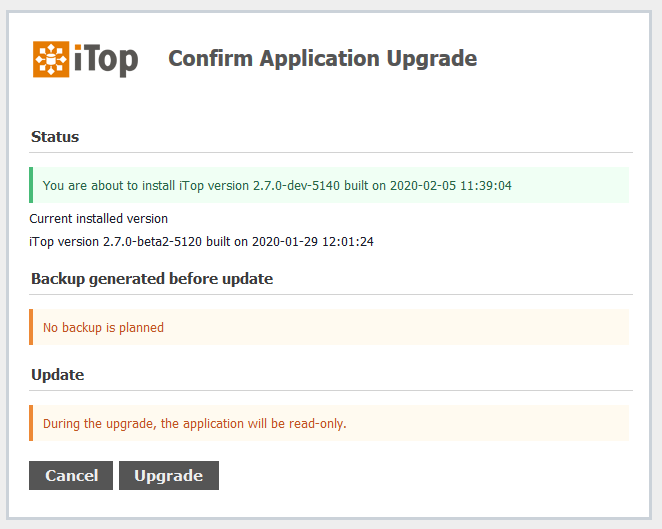 This action, limited to iTop Administrators, allow to upgrade the iTop application code from your web browser, without the need to connect to the iTop server.