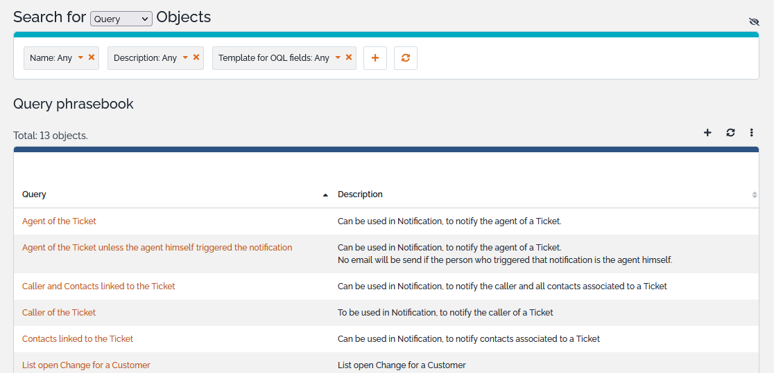 The Query Phrasebook stores a list of ready-to-run OQL queries so that end-users can easily execute complex queries defined by an administrator.