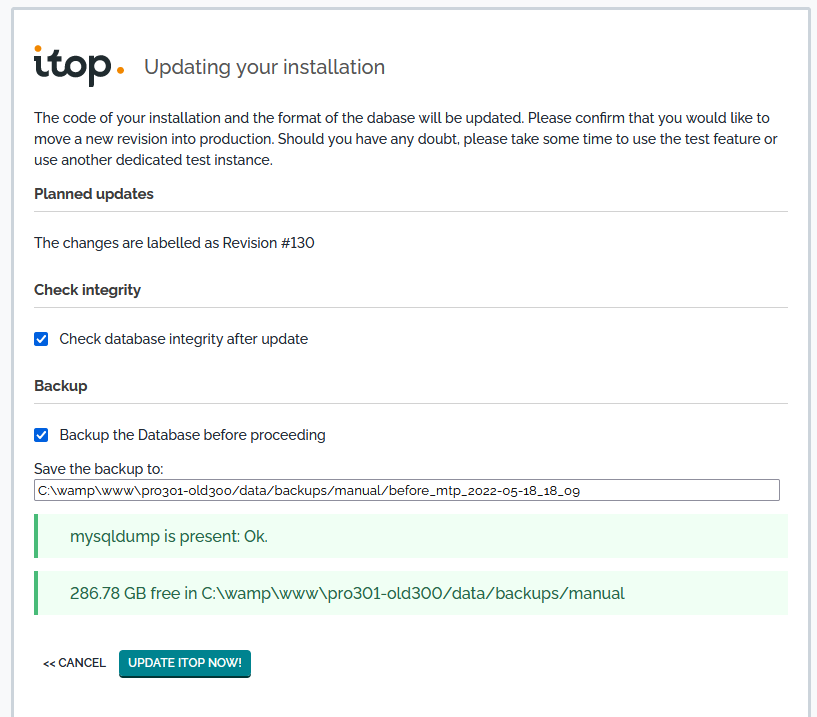 Click on the button Update iTop Code to: