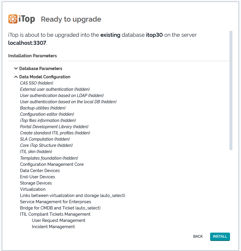 The installation of iTop is generally performed interactively using the “setup” page. However once information about the desired configuration has been collected by the setup page, the actual installation process is fully unattended and therefore can be automated.