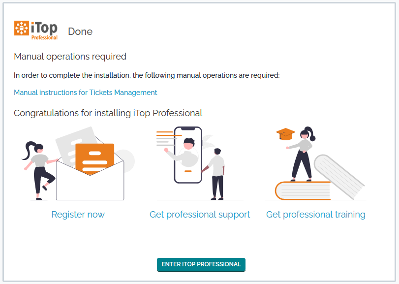 Once the installation is done, you can: Review the instructions about setting up the background tasks, by clicking the link “Manual instructions for Tickets Management”. Or enter iTop immediately by clicking on the “Enter iTop” button.