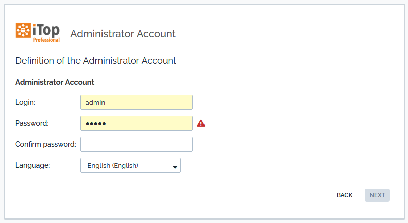 The next step of the wizard prompts you for the information about the administrator account. iTop authentication can rely on external mechanisms (LDAP, Active Directory or JASIG-CAS) but the installation requires that at least one administrator account be created with a local password.