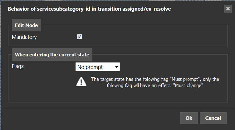 If one (or more) state(s) inherit their flags from the current state, and do not overload the behavior for the selected field, a warning message is displayed to inform the user that the modification of the behavior of this field will also have an impact in the other states.