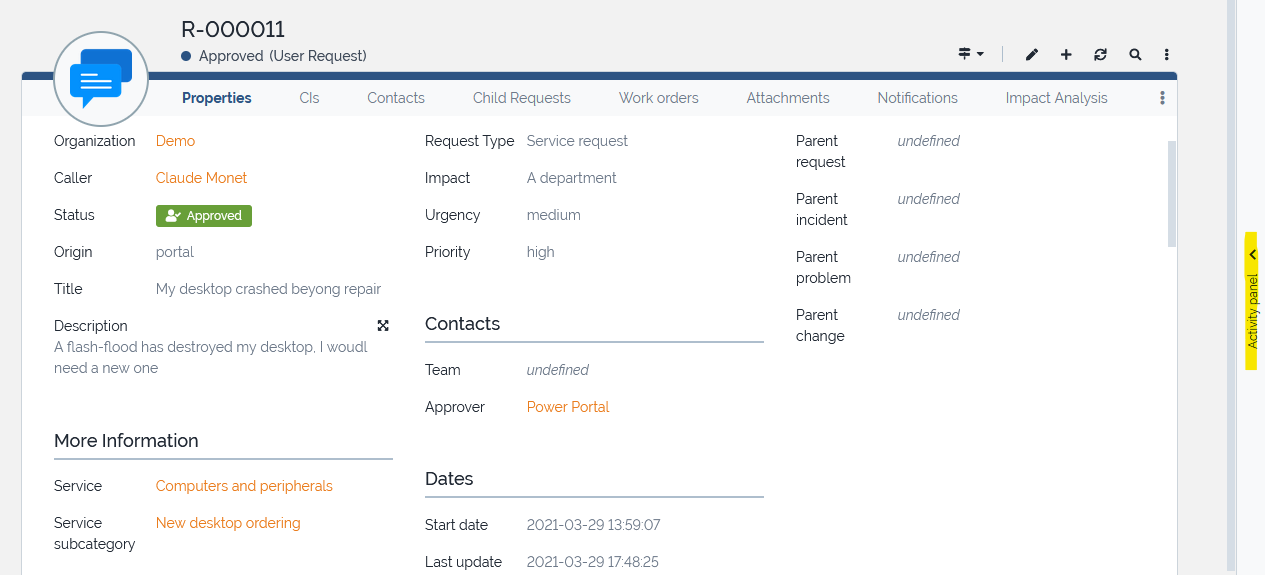 The details of an object are always displayed in the same manner in iTop, as shown below:
