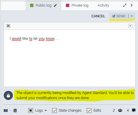 • If a user enter some text or just try to edit a caselog in the activity panel of an object currently under edition, or simply under caselog edition by another user, then the first user receive a small message to let him know that he will only be able to submit his entries once the other user will have finished. Notice that the Send button is greyed for that first user.