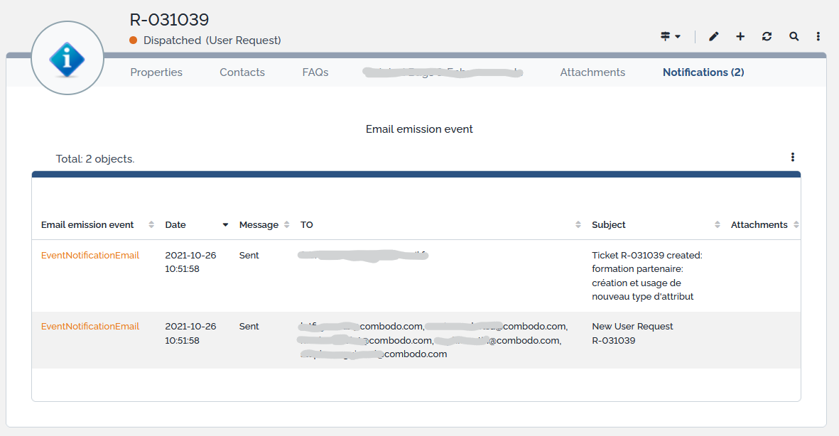 You can see which notification had been sent for a given ticket (User Request, Incident, Change) using the tab “Notifications” in the details of the ticket.