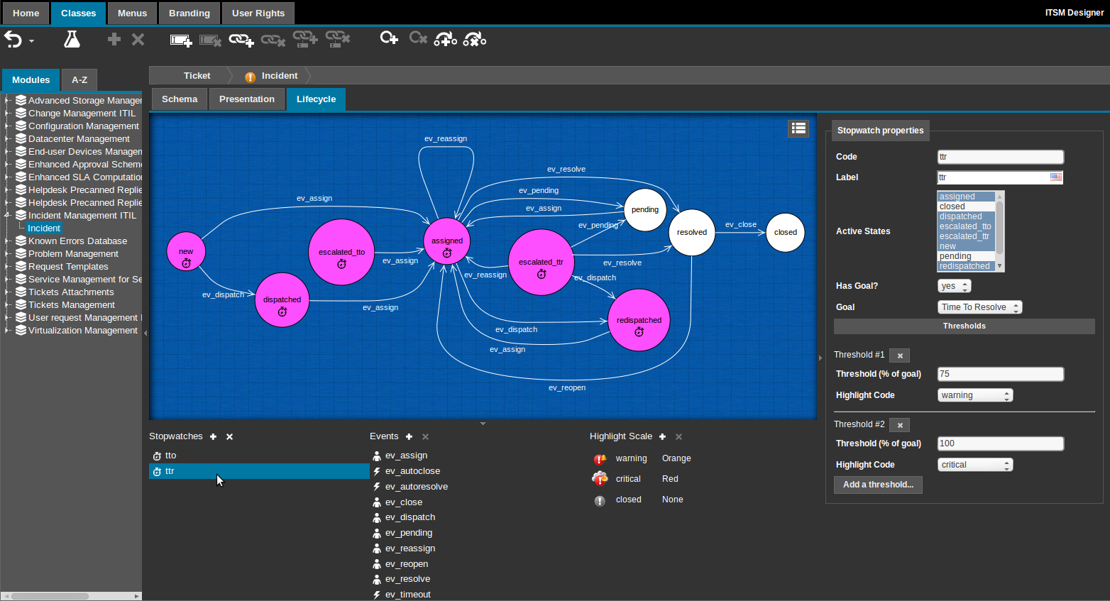 <classes> <class id="UserRequest"> <fields> <!-- Add a new state value to the existing status --> <field id="status" _delta="must_exist"> <values> <value id="pending_provider" _delta="define">pending_provider</value> </values> </field> <!-- Add a stopwatch to count the timespent in this state --> <field id="providerstopwatch" xsi:type="AttributeStopWatch" _delta="define"> <states> <!-- this are the states, during which the stopwatch is counting time --> <state id="pending_provider">pending_provider</state> </states> <working_time/> <thresholds/> <always_load_in_tables>true</always_load_in_tables> </field> <!-- Declaring this stopwatch sub-item is required to display or query it --> <field id="pending_provider_delay" xsi:type="AttributeSubItem" _delta="define"> <target_attcode>providerstopwatch</target_attcode> <!-- Possible item_code: timespent, started, laststart, stopped --> <item_code>timespent</item_code> </field> </fields> <lifecycle> <stimuli> <!-- Add a new stimulus to switch to pending_provider state --> <stimulus _delta="define" id="ev_pending_provider" xsi:type="StimulusUserAction"/> </stimuli> <states> <!-- This level define the state we are in --> <state id="assigned" _delta="must_exist"> <transitions> <!-- this define an available transition from the above state --> <transition id="ev_pending_provider" _delta="define"> <!-- This define the stimulus which trigger the transition --> <!-- on a given state there can only be one transition triggered by a given stimulus --> <stimulus>ev_pending_provider</stimulus> <!-- This define on which state the UserRequest will end-up --> <target>pending_provider</target> <actions/> </transition> </transitions> </state> <!-- From the new state --> <state id="pending_provider" _delta="define"> <flags /> <!-- Also empty it's a mandatory tag --> <transitions> <!-- we want to assign the ticket back to the support team --> <transition id="ev_assign"> <stimulus>ev_assign</stimulus> <target>assigned</target> <actions/> </transition> </transitions> <!-- The fields are the same as in "assigned" state --> <inherit_flags_from>assigned</inherit_flags_from> </state> <state _delta="must_exist" id="new"> <flags> <!-- Hide the pending provider_delay, it will propagate to all chained states --> <attribute id="pending_provider_delay" _delta="define"> <hidden/> </attribute> </flags> </state> <state id="resolved" _delta="must_exist"> <flags> <attribute id="pending_provider_delay" _delta="define"> <!-- Read_only takes precedence on hidden ??? --> <read_only/> </attribute> </flags> </state> </states> </lifecycle> <!-- Display the 2 new fields in the details of the UserRequest --> <presentation> <details _delta="must_exist"> <items> <!-- First column of the UserRequest display --> <item id="col:col0"> <items> <item id="fieldset:Ticket:moreinfo"> <items> <!-- Add the provider timespent delay --> <item id="pending_provider_delay" _delta="define"> <rank>80</rank> </item> <!-- This displays a stopwatch (including some sub-items) --> <!-- This will help you to understand how a stopwatch behave --> <item id="providerstopwatch" _delta="define"> <rank>90</rank> </item> </items> <rank>20</rank> </item> </items> </item> </items> </details> </presentation> </class> </classes> <dictionaries> <dictionary id="EN US"> <entries> <!-- Give a label to the new state --> <entry id="Class:UserRequest/Attribute:status/Value:pending_provider" _delta="define"> <![CDATA[Pending provider]]> </entry> <entry id="Class:UserRequest/Attribute:pending_provider_delay" _delta="define"> <![CDATA[Provider time spent]]> </entry> <entry id="Class:UserRequest/Stimulus:ev_pending_provider" _delta="define"> <![CDATA[Wait for Provider]]> </entry> <entry id="Class:UserRequest/Attribute:providerstopwatch" _delta="define"> <![CDATA[Provider stopwatch]]> </entry> </entries> </dictionary> </dictionaries>