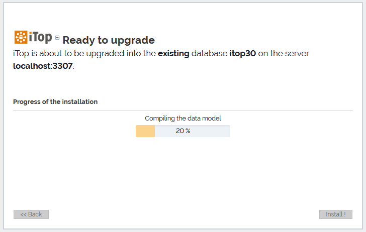 The installation of iTop is generally performed interactively using the “setup” page. However once information about the desired configuration has been collected by the setup page, the actual installation process is fully unattended and therefore can be automated.