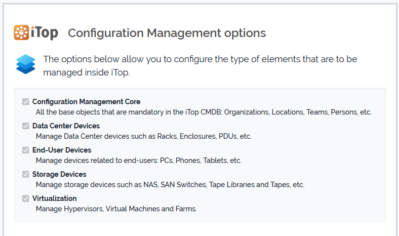 The following steps of the installation wizard will help you tailor the “data model” of iTop in order to best suit your needs.