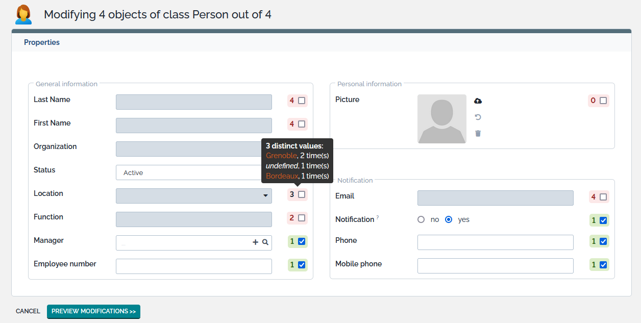 The object modification form appears with a checkbox and a numeric indicator next to each field. The indicator tells how many different values exist for this specific field among all the selected objects. If all objects have the same value for this field, the indicator is green (Only One Value), the checkbox is checked and the field is editable. Otherwise, the indicator is red and the checkbox is unchecked. When the pointer of the mouse is positioned over a red indicator, a tooltip is displayed showing information about the different values of the field.