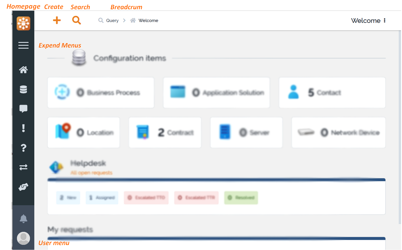 • A click on this logo will bring you back to iTop homepage, by default it is the Welcome dashboard!