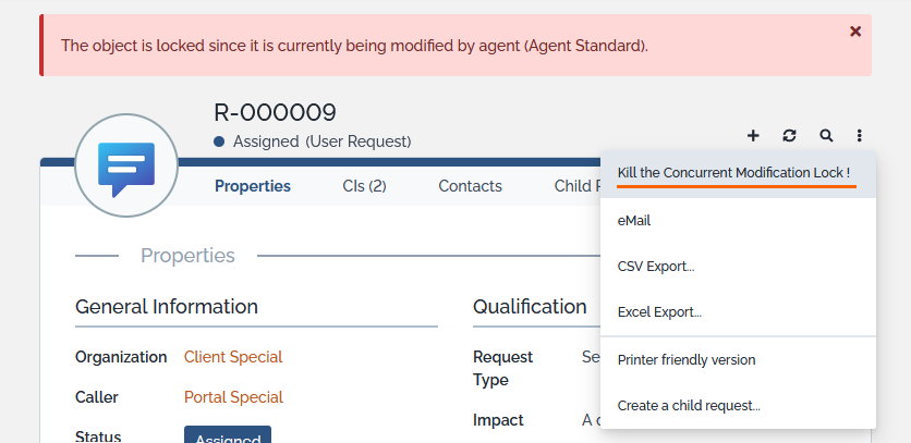 Users with a specific (configurable) profile can “kill” this “lock”. Be aware that in such a case, the user currently editing the object may no longer be able to submit her/his modifications. This feature is provided only for emergency cases when the object must be updated while the “owner” of the lock is unreachable.