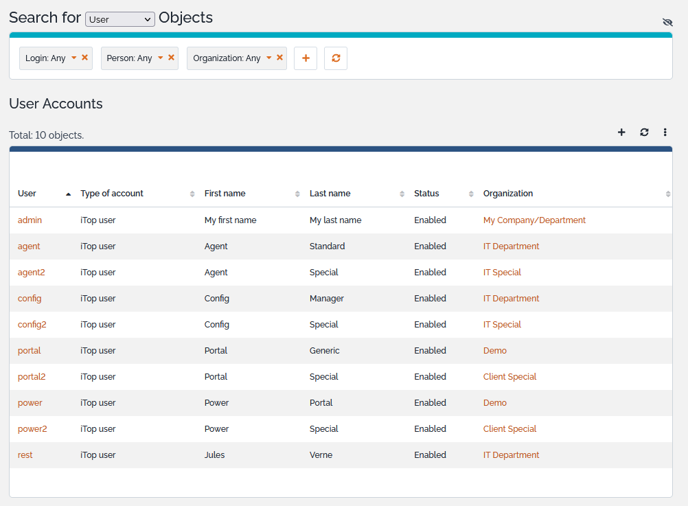• iTop user accounts are internal to iTop. Their passwords are stored (encrypted) within the database of iTop. This type of account is useful for administrative users, for scripts and integration with other applications.