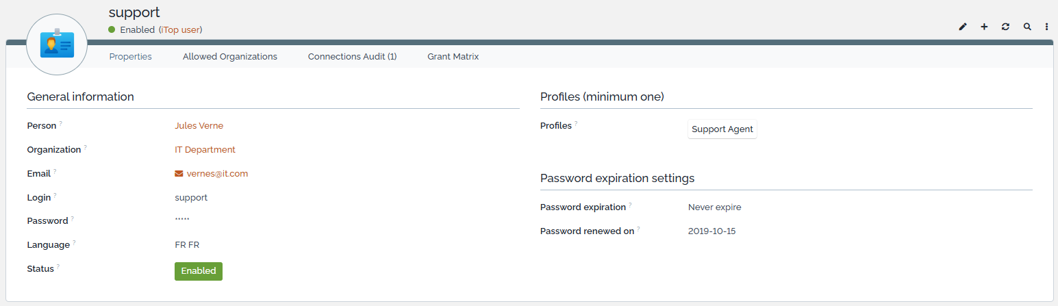 • The list of profiles for this account. Each iTop user account must have at least one profile.