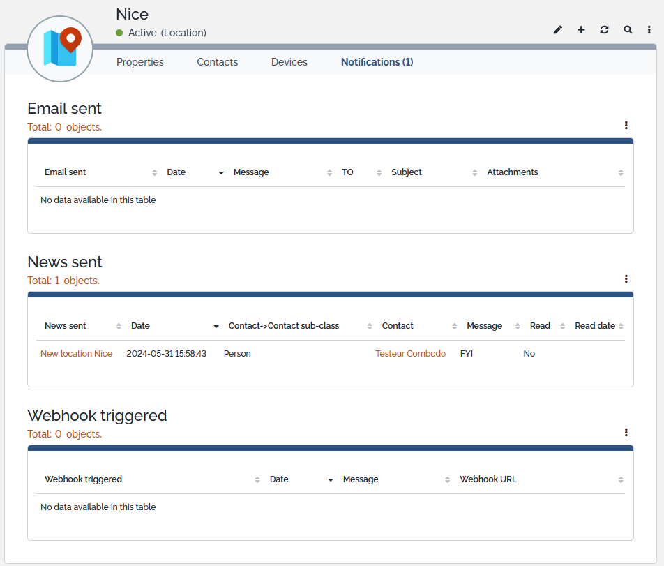 On an iTop object, which has triggered notifications, you can see them in a dedicated tab.