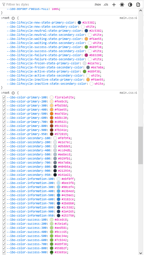 To use an existing iTop SCSS color code, check the existing values within a 3.0+ iTop with the browser development tool. Then transform it adding a $ resulting in this syntax: $ibo-lifecycle-success-state-primary-color The advantage of using those existing colors, is that a theme creation or modification would apply to your setting/new classes, so you keep consistency within your iTop.