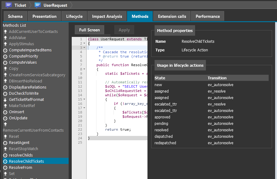 For methods which can be called from the object lifecycle, the right panel displays the state and stimuli which are calling this method as an action