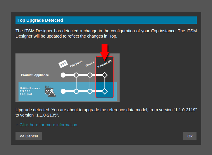 In some cases the new version of iTop may support new features (or new possibilities of customization) which are not backward compatible. In such a case, a warning message will be displayed to inform you that once the reference data model is switched to the new version, it will not be possible to switch back to the previous version of iTop.