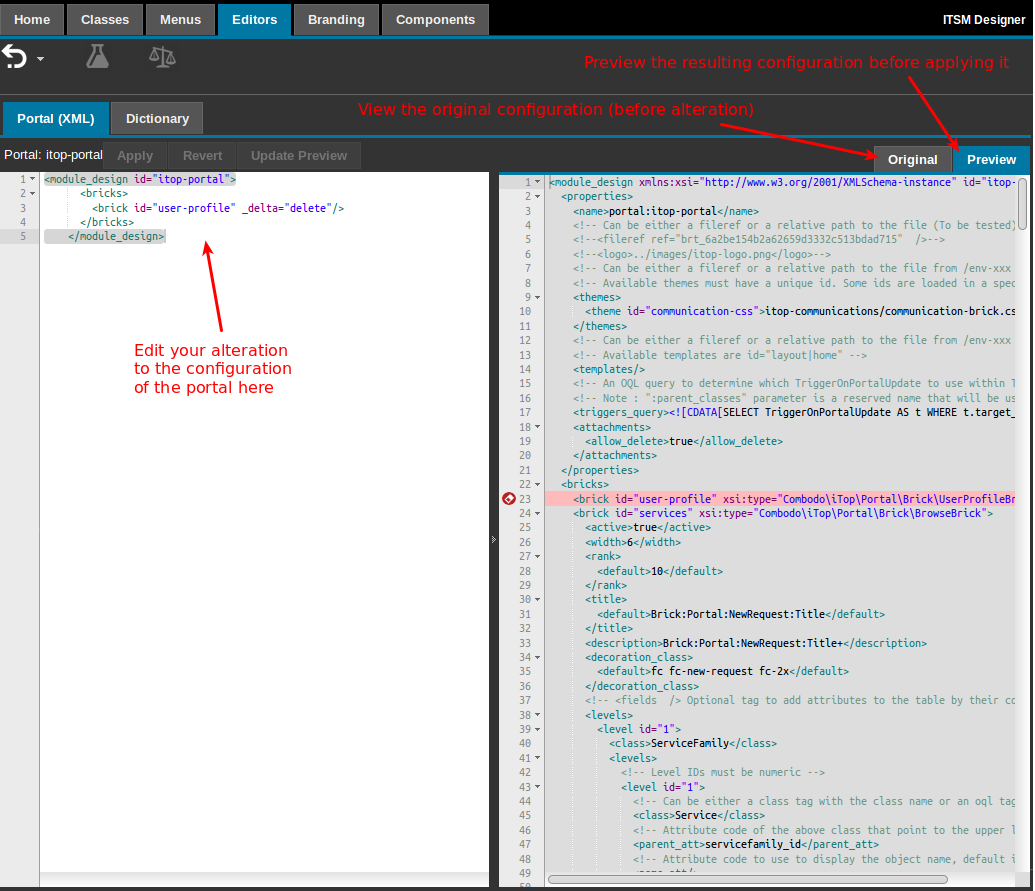 • This tab displays - side by side - the XML alteration to the portal configuration (on the left) and either the original XML or the resulting XML (on the right).
