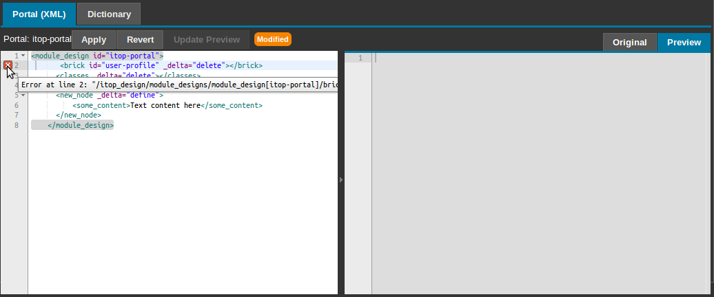 When clicking on “Apply” or “Update Preview”, if the entered XML alteration is not valid because either: