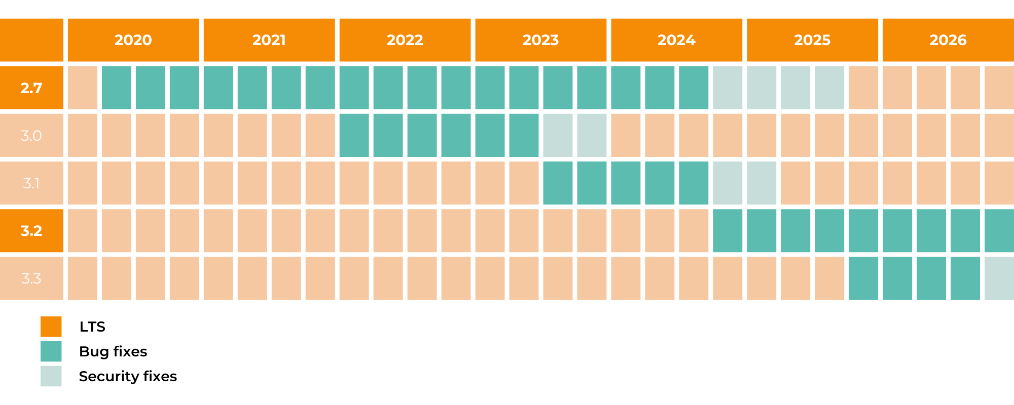 The 2.7 branch is the first Long Term Support (LTS). It is now under security fixes until September 2025.