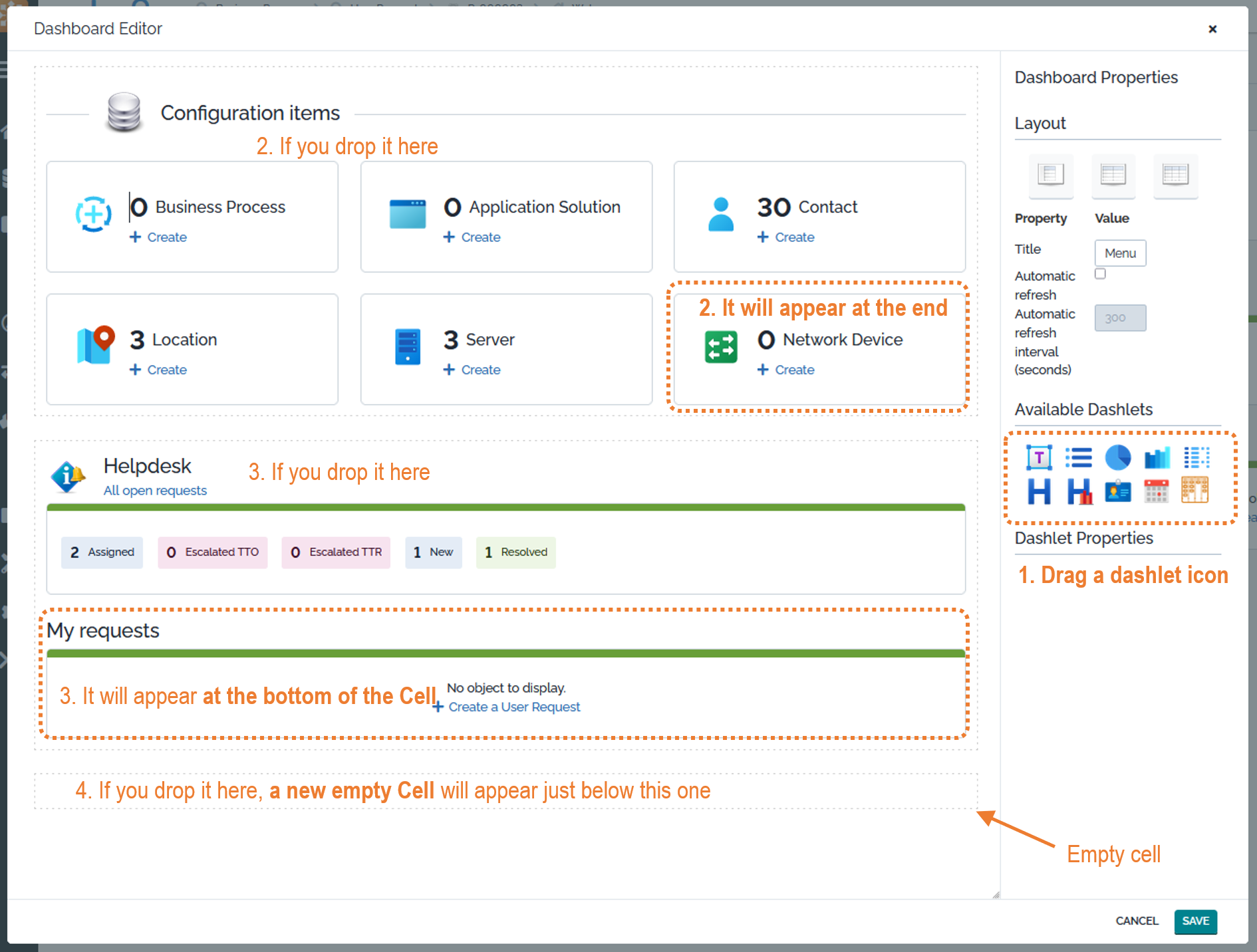 Sometimes it's a bit difficult to reorganize a dashboard manually, especially if you have a lot of dashlets within a cell and want to split them in multiple cells.