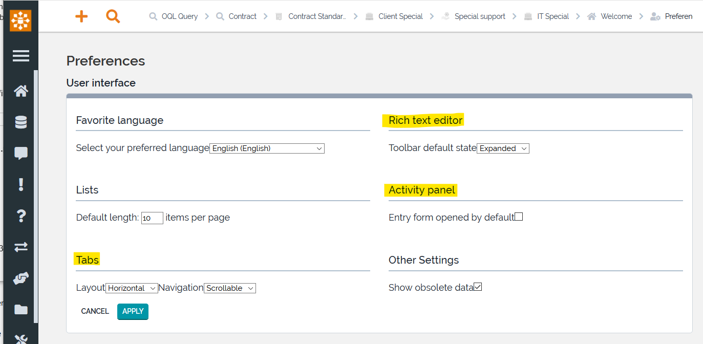 • The option Show obsolete data unchecked by default, allow to display obsolete objects in drop-down lists and search results