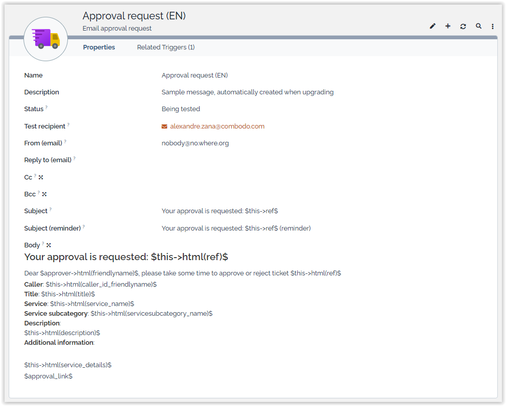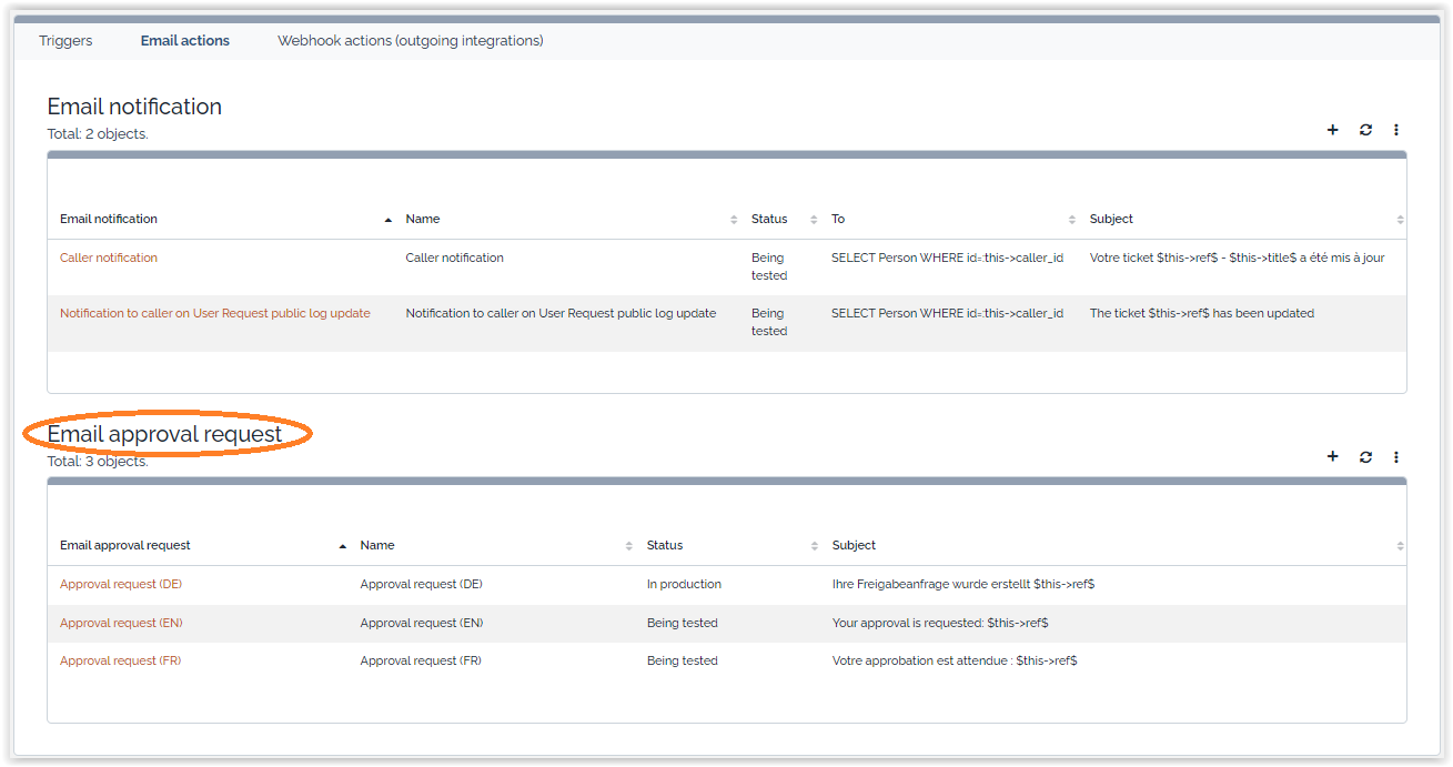 | 2023-07-13 | 2.2.0 | * Fix RecordComment date format * N°5440 - Add compatibility with iTop 3.1 (Symfony 5.4, remove require of obsolete files) * N°6180 - Enhancement on approval notification edition * N°3482 - Email approval request : Set sender (from and reply to) display name / label in action email * N°6466 - CS CZ translations (thanks to Stetinac !) |