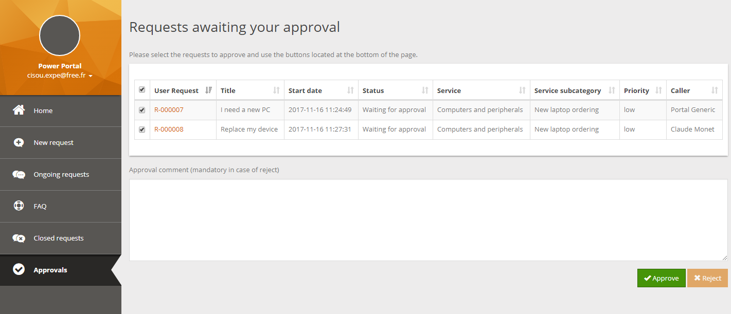 The page shows a list of the User Requests having an approval process running, and for which your approval is being requested: