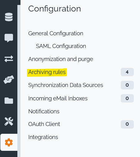 For administrators and users with a profile allowed to modify the class ArchivingRule (eg, profile Archiving Agent with id 52), a new menu is proposed under “iTop configuration”, called Archiving rules.