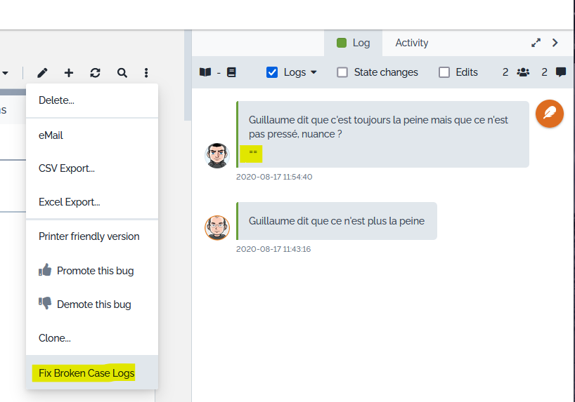 Note the == text in the caselog, it's a suspect details often linked to a misalignment of the caselog index. The menu just recompute the index, it does not modify the content itself.