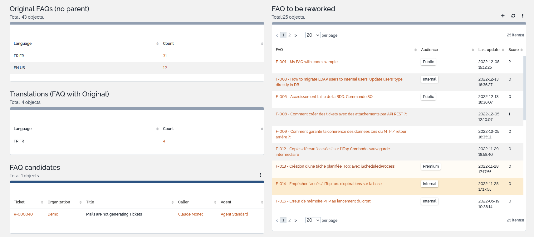 FAQ Overviewhas Dashlets to count the FAQ per language to track missing translation.
