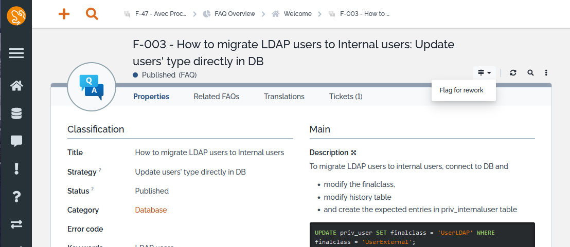 Allow to flag a published FAQ for rework (FAQs to rework are listed in a