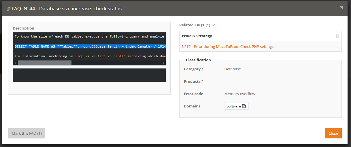 Allow a agent to tag a Ticket as candidate for writing a FAQ documenting the issue of the Ticket (User Request, Incident, Change, Problem). The action of creating a FAQ based on a User Request is part of the Problem Management.