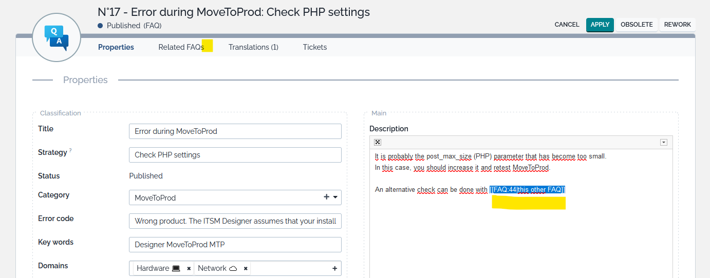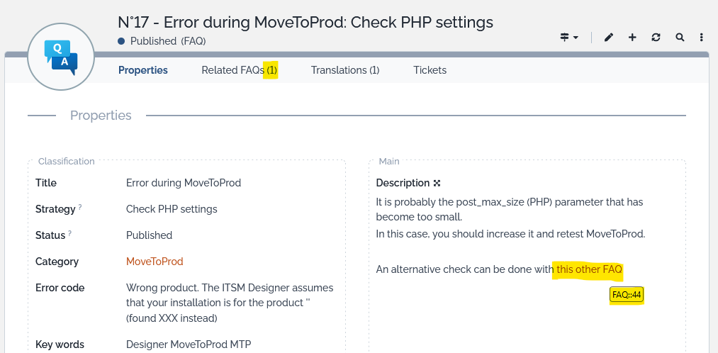 'combodo-faq-advanced' => array ( 'faq-attribute-to-search' => 'key_words', // or description or error_code 'combine-keywords' => 'yes', // yes="All keywords required", no = "at least one" 'compute-related-faqs' => 'yes', // default no, parse description to retrieve FAQ pointed in the text and link them explicitly ),