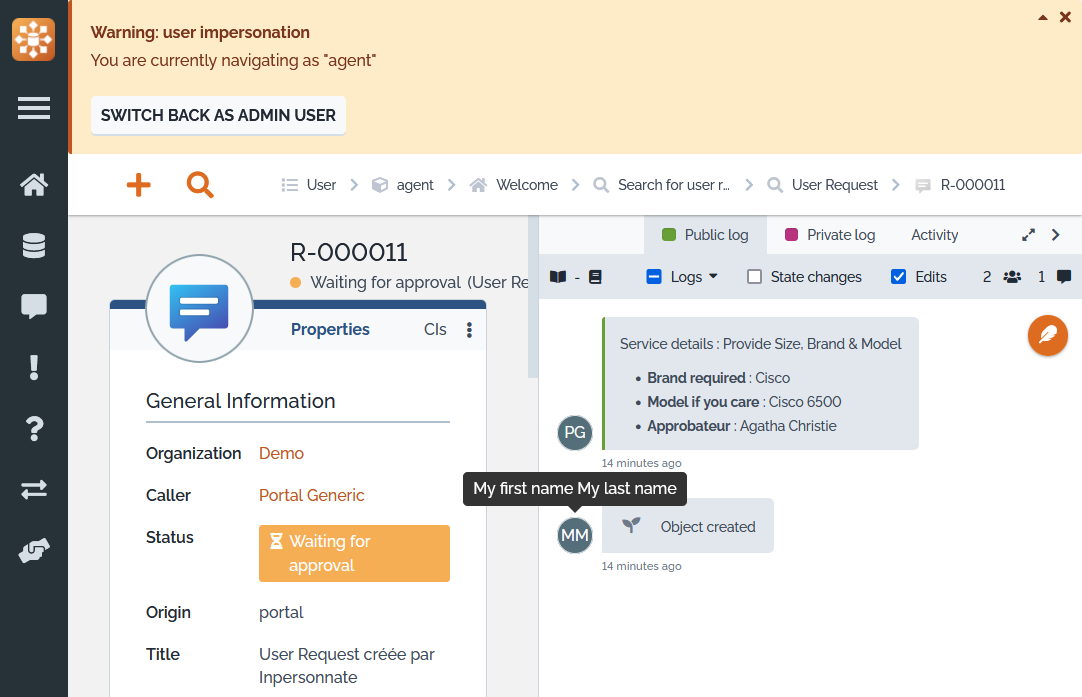 Using this extension someone allowed can āImpersonateā another user and navigate in iTop exactly as the impersonated user would do.