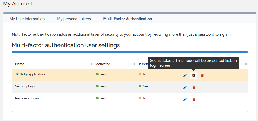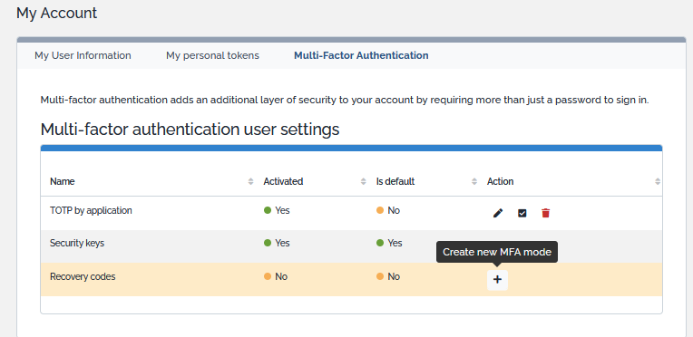 | Account Recovery via recovery codes | Allows users to ask to have a list of recovery codes in order to regain account access. These codes are usable only once. However user have the possibility to regenerate these codes. This action disable the previous codes. |