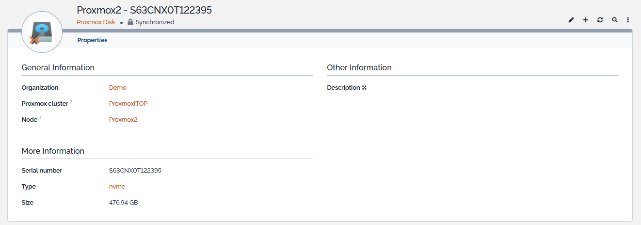 | Proxmox cluster | Foreign key to a(n) Proxmox Cluster | Cluster to which the disk belongs | Yes |