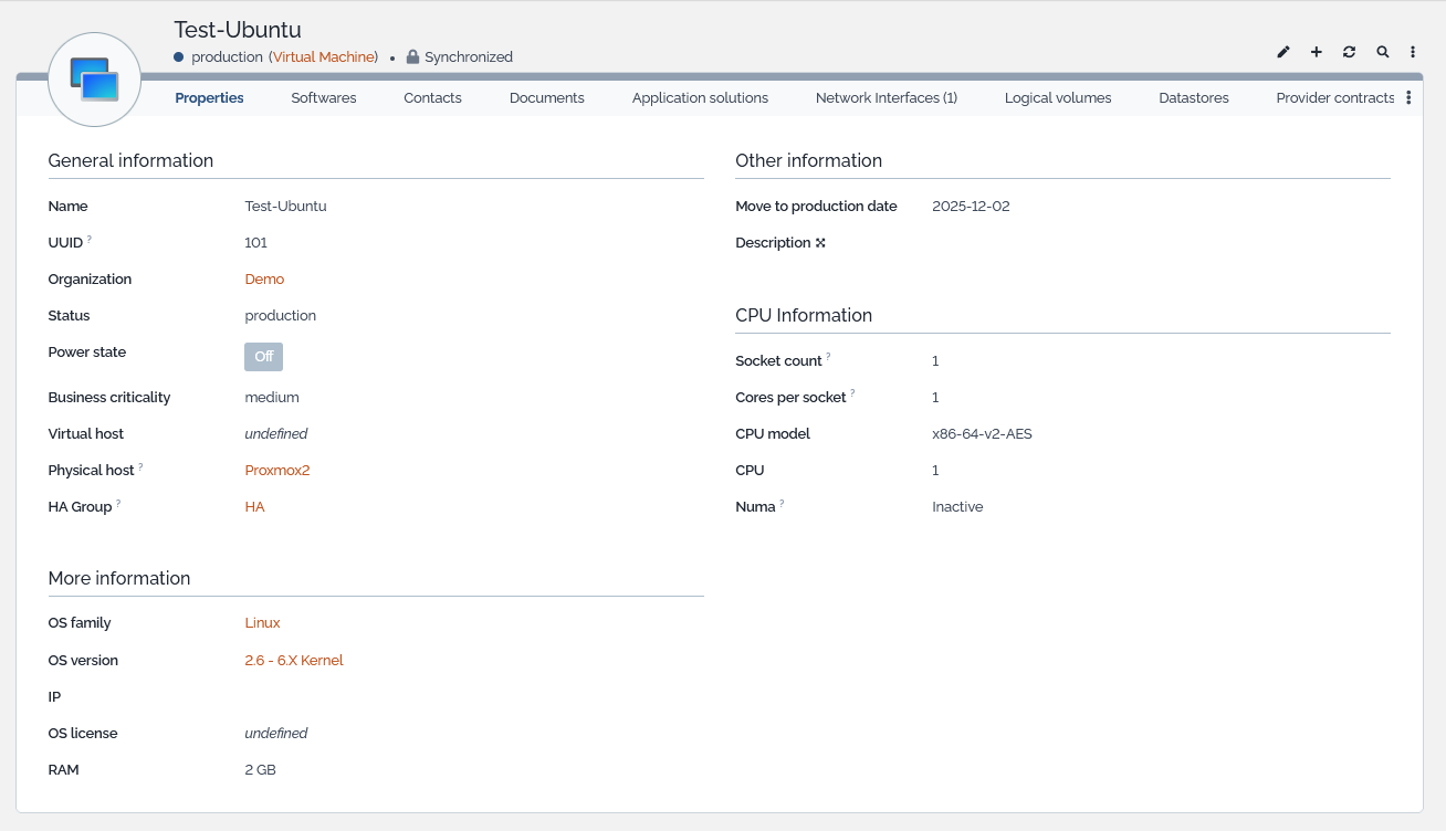 This extension is dedicated to Proxmox, the server virtualization platform that automates the management of virtual machines. It enhances iTop's CMDB by modelizing Proxmox elements that are not part of iTop's default CIs (Clusters, Storage, Containers…) and by adding attributes to some of the existing devices (Servers, Virtual Machines). Combined with the Data collector for Proxmox, it allows Proxmox administrators to fetch in iTop the key elements of their Proxmox infrastructure.
