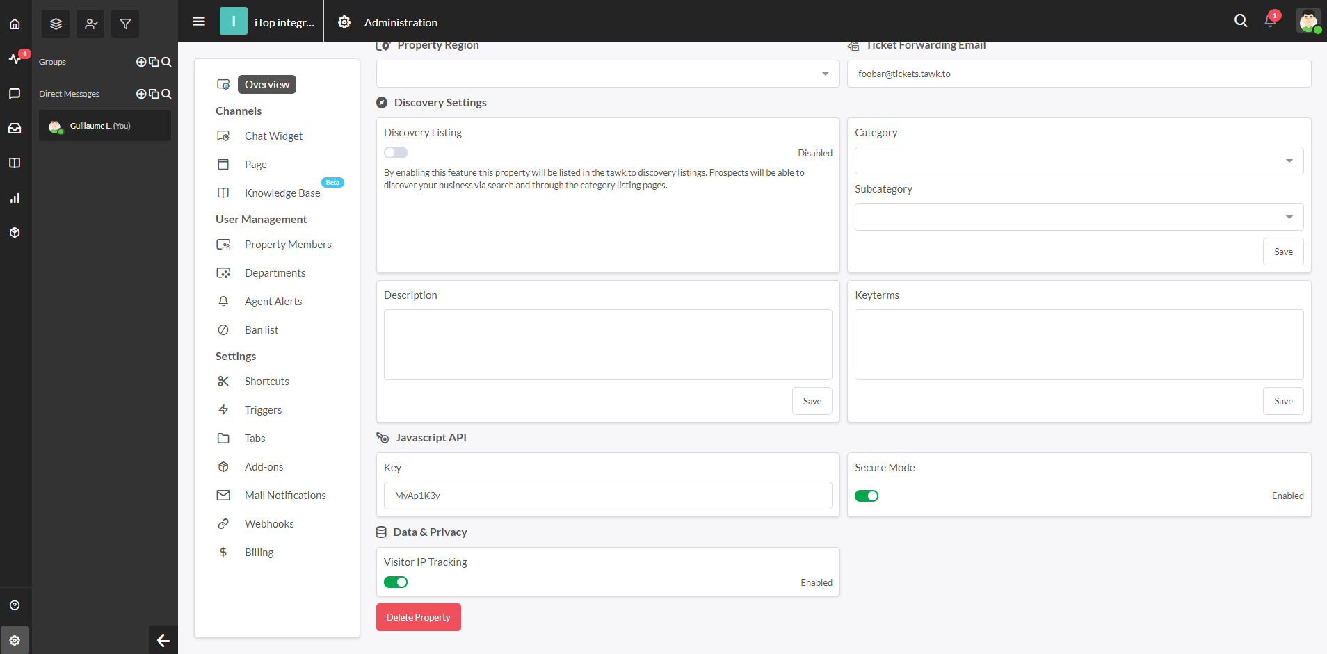 'combodo-tawk-integration' => array ( 'property_id' => 'PUT_YOUR_PROPERTY_ID_HERE', 'widget_id' => 'PUT_YOUR_WIDGET_ID_HERE', 'api_key' => 'PUT_YOUR_API_KEY_HERE', // Used only with "secure mode", see section below 'enabled_portals' => array ( 'itop-portal', ), 'allowed_profiles' => array( 'Portal user', ), ),