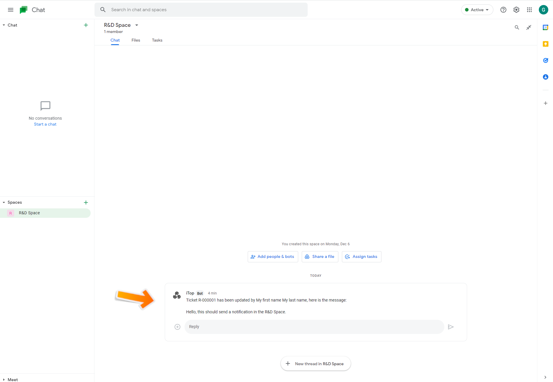Google Chat notificationto send a message to a Google Chat channel / user -